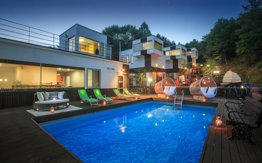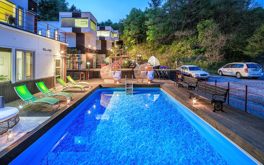 각 다른 컨셉의 단독건물로 되어 있는 모모의 다락방은카페 바로 옆에 수영장이 있답니다.